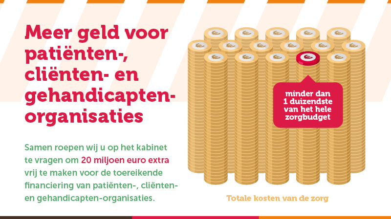 Ministeries, gemeenten en maatschappelijke sectoren doen een toenemend beroep op ons. De vraag naar ervaringsdeskundigen en ervaringskennis en de roep om de menselijke maat is enorm. De toegenomen inzet van patiënten-, cliënten- en gehandicaptenorganisaties vraagt om een groter budget dan de afgelopen jaren het geval was. De financiële middelen, die grotendeels worden verkregen uit het voorgestelde pg-beleidskader van het ministerie van VWS, zijn ontoereikend.