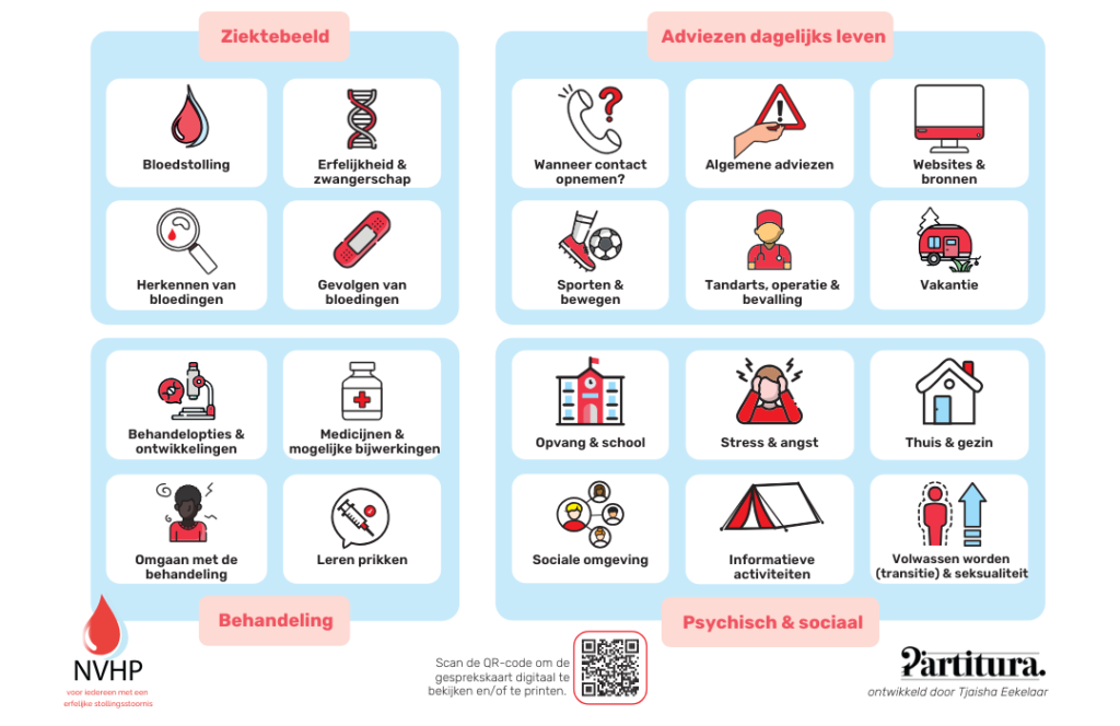 Het Erasmus MC heeft samen met de NVHP gespreks- en praatkaarten ontwikkeld. Deze kaarten zijn gemaakt om uitleg over erfelijke stollingsstoornissen makkelijker en duidelijker te maken. De kaarten zijn te herkennen aan de naam: Samen in Gesprek, over erfelijke stollingsstoornissen in begrijpelijke taal. De kaarten ondersteunen bij het gesprek met de zorgverlener, maar kunnen ook thuis gebruikt worden. Bijvoorbeeld om informatie terug te lezen of om informatie te delen met familie, vrienden of docenten.