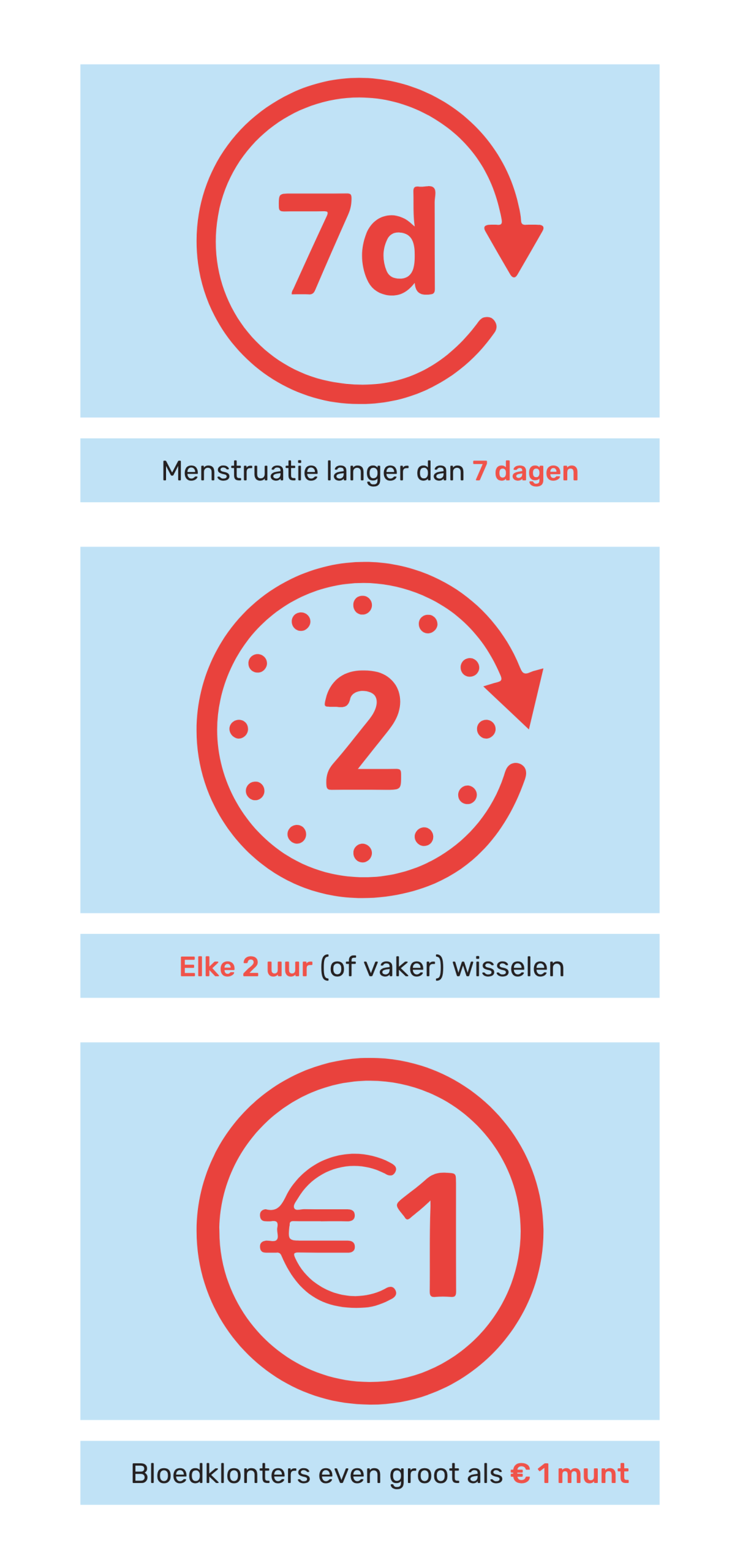 De gemiddelde vrouw verliest 50 ml bloed per menstruatie periode. Dit kan in 2 of in 7 dagen gebeuren. Bij 100 tot 150 ml per menstruatie, spreken we van te veel bloedverlies. Menstruaties zijn ernstig als een vrouw tussen de periodes door te weinig tijd heeft om te herstellen en aan bloedarmoede lijdt. Maar ook als een vrouw tijdens de menstruatie de deur niet uit kan door te veel bloedverlies of pijnklachten. Oftewel als het het dagelijkse leven van een vrouw zo beïnvloed dat ze niet normaal kan functioneren. Een goede maatstaaf is de 7-2-1 regel.
